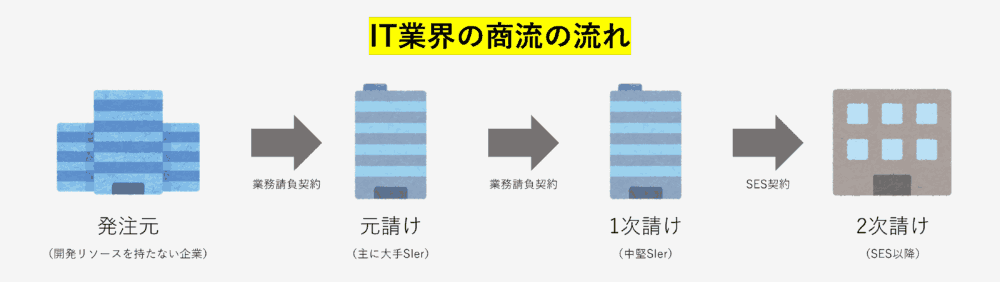IT業界の商流は、基本的に「発注企業⇒元請けSIer⇒一次請けIT⇒・・・以下SES」となっています。